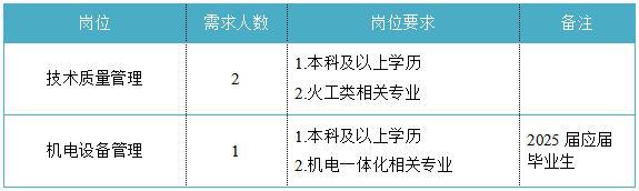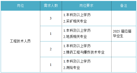 福建省機(jī)電(控股)有限責(zé)任公司(福建省國(guó)防科技工業(yè)公司)是由原省國(guó)防科工辦所屬企業(yè)為主,原省機(jī)械廳所屬企業(yè)劃入組建的省國(guó)資委出資的國(guó)有企業(yè),現(xiàn)有全資、控股和參股企業(yè)48家。 在閩唯一一家地方軍工企業(yè);民爆物品生產(chǎn)與銷(xiāo)售資質(zhì)、軍品科研與生產(chǎn)資質(zhì)、硝酸銨生產(chǎn)與銷(xiāo)售資質(zhì)、營(yíng)業(yè)性爆破作業(yè)單位一級(jí)資質(zhì)、礦山工程施工總承包一級(jí)資質(zhì)、環(huán)保工程專(zhuān)業(yè)承包三級(jí)資質(zhì);國(guó)家甲級(jí)設(shè)計(jì)院,擁有工業(yè)與民用建筑工程設(shè)計(jì)、咨詢(xún)、工程監(jiān)理等綜合資質(zhì);華東地區(qū)最大的硝酸銨生產(chǎn)企業(yè)... 省級(jí)重點(diǎn)實(shí)驗(yàn)室 1個(gè) 省級(jí)工程技術(shù)研究中心 2個(gè) 省級(jí)企業(yè)技術(shù)中心 3個(gè) 省級(jí)技能大師工作室 2個(gè) 五險(xiǎn)二金 帶薪年假 工會(huì)福利 健康體檢 午餐補(bǔ)貼 通訊補(bǔ)貼 文體活動(dòng)...... (一)基本條件 1.具有中華人民共和國(guó)國(guó)籍,擁護(hù)中國(guó)共產(chǎn)黨的領(lǐng)導(dǎo),熱愛(ài)社會(huì)主義; 2.遵紀(jì)守法,無(wú)違法違紀(jì)違規(guī)等不良記錄; 3.具有良好的身體素質(zhì)和心理素質(zhì); 4.具備符合崗位要求的文化程度和工作能力。 (二)資格條件 應(yīng)屆高校畢業(yè)生(含:①2025年度應(yīng)屆高校畢業(yè)生,以畢業(yè)證書(shū)落款年度為準(zhǔn),已簽訂就業(yè)協(xié)議、勞動(dòng)合同、繳交社保等均不影響應(yīng)屆生身份界定;②2024年度畢業(yè)、具有工作經(jīng)歷及社保繳交記錄的高校畢業(yè)生;③畢業(yè)離校兩年內(nèi)未就業(yè)的高校畢業(yè)生,畢業(yè)證書(shū)落款時(shí)間應(yīng)為2023年1月1日以后),具備符合崗位要求的文化程度和工作能力。 聯(lián)系人:吳先生 聯(lián)系電話:0598-3838649 工作地點(diǎn):福建永安 1.福建海峽科化股份有限公司永安分公司(1人) 聯(lián)系人:田經(jīng)理 聯(lián)系電話:0598-3810809 工作地點(diǎn):福建永安 2.福建海峽科化股份有限公司福安分公司(1人) 聯(lián)系人:林經(jīng)理 聯(lián)系電話:0593-6330993 工作地點(diǎn):福建福安 3.福建海峽科化股份有限公司烽林分公司(7人) 聯(lián)系人:吳經(jīng)理 聯(lián)系電話:0598-2792107 工作地點(diǎn):三明明溪 4.福建海峽科化股份有限公司永春分公司(3人) 聯(lián)系人:賀經(jīng)理 聯(lián)系電話:0595-23989536 工作地點(diǎn):福建永春 5.福建海峽科化富興建設(shè)工程有限公司(7人) 聯(lián)系人:楊女士 聯(lián)系電話:18250589968 工作地點(diǎn):福建三明 6.福建民化建設(shè)工程有限公司(2人) 聯(lián)系人:鄒女士 聯(lián)系電話:13950807836 工作地點(diǎn):福建省內(nèi) 7.青海青樂(lè)化工機(jī)械有限責(zé)任公司(22人) 聯(lián)系人:李先生 聯(lián)系電話:0972-8655285 工作地點(diǎn):青海省海東市樂(lè)都區(qū) 8.青海海西東諾化工有限公司(4人) 聯(lián)系人:郭先生 聯(lián)系電話:13860516289 工作地點(diǎn):青海省德令哈市 聯(lián)系人:李先生 聯(lián)系電話:0533-2343718 工作地點(diǎn):山東沂源 聯(lián)系人:米先生 聯(lián)系電話:15280522275 工作地點(diǎn):福建邵武 福建省機(jī)電沿海建筑設(shè)計(jì)研究院有限公司(4人) 聯(lián)系人:李女士 聯(lián)系電話:0591-87386017 工作地點(diǎn):福建福州 福建智和置業(yè)有限公司(2人) 聯(lián)系人:吳先生 聯(lián)系電話:18695719052 工作地點(diǎn):福建福州 符合崗位招聘條件的應(yīng)聘者可請(qǐng)將簡(jiǎn)歷投遞至指定郵箱:fndic25@163.com;并將郵件標(biāo)題和簡(jiǎn)歷名稱(chēng)命名為“崗位+姓名+畢業(yè)院校+專(zhuān)業(yè)”。 即日起開(kāi)始接受報(bào)名,截止時(shí)間為2024年12月31日。 招聘工作按照簡(jiǎn)歷投遞-資格審查篩選-筆試-面試-發(fā)放OFFER-體檢-公示-簽約錄用等程序進(jìn)行。 資格審查貫穿招聘全過(guò)程,在招聘各環(huán)節(jié)若有發(fā)現(xiàn)報(bào)考信息不實(shí)、條件不符等情形的,一律取消應(yīng)聘資格,不得進(jìn)入下一環(huán)節(jié);已經(jīng)錄用的,我司有權(quán)解除勞動(dòng)關(guān)系,由此發(fā)生的個(gè)人損失由應(yīng)聘人員自行承擔(dān)。 按照招聘條件對(duì)應(yīng)聘人員進(jìn)行資格審查,擇優(yōu)確定參加筆試和面試人員。審核通過(guò)者將通過(guò)電話或郵件方式通知,審核未通過(guò)者不再另行通知。 公開(kāi)招聘工作堅(jiān)持“公開(kāi)、平等、競(jìng)爭(zhēng)、擇優(yōu)”的原則,嚴(yán)肅紀(jì)律,秉公辦事,嚴(yán)禁弄虛作假,徇私舞弊,全程接受紀(jì)檢監(jiān)察部門(mén)和社會(huì)的監(jiān)督。報(bào)考者有弄虛作假、違紀(jì)違規(guī)行為的,一經(jīng)發(fā)現(xiàn),均取消其應(yīng)聘資格,并將有關(guān)情況通報(bào)其所在學(xué)校或單位。構(gòu)成犯罪的,依法追究刑事責(zé)任。